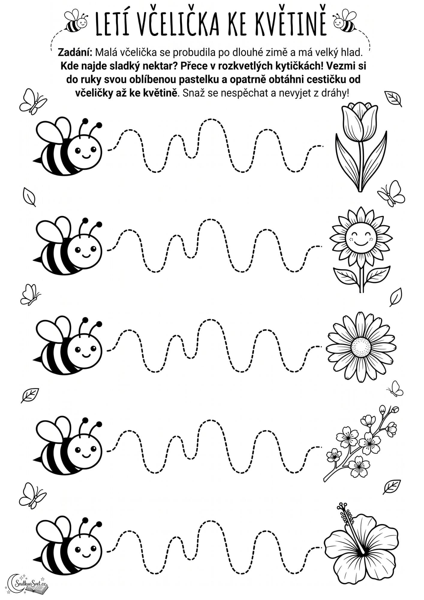 S teplejším počasím se probouzejí i pilné včeličky, které mají po dlouhé zimě pořádný hlad. A právě jedna taková malá včelička je hlavní hrdinkou našeho nového pracovního listu. Připravte si pastelky, jdeme trénovat ruku a pomáhat včeličce najít cestu za sladkým nektarem!