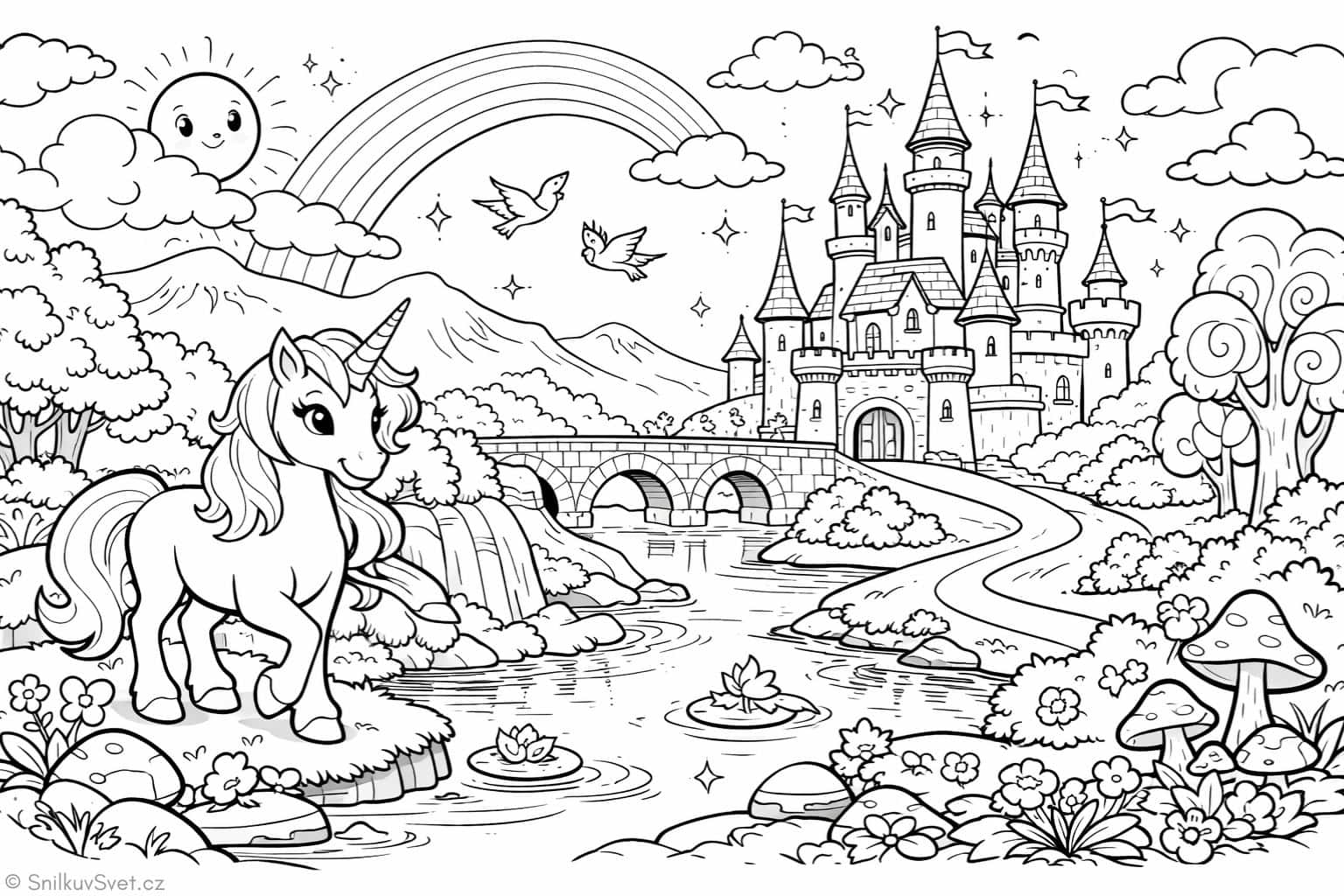 Vstupte do kouzelné pohádkové krajiny plné fantazie. Tato detailní omalovánka zachycuje jednorožce u klidné řeky, pohádkový zámek, duhu i kouzelnou přírodu. Ideální pro děti i dospělé, kteří si chtějí odpočinout u tvoření. Formát A4 na šířku je perfektní pro tisk a vybarvování pastelkami i fixami.