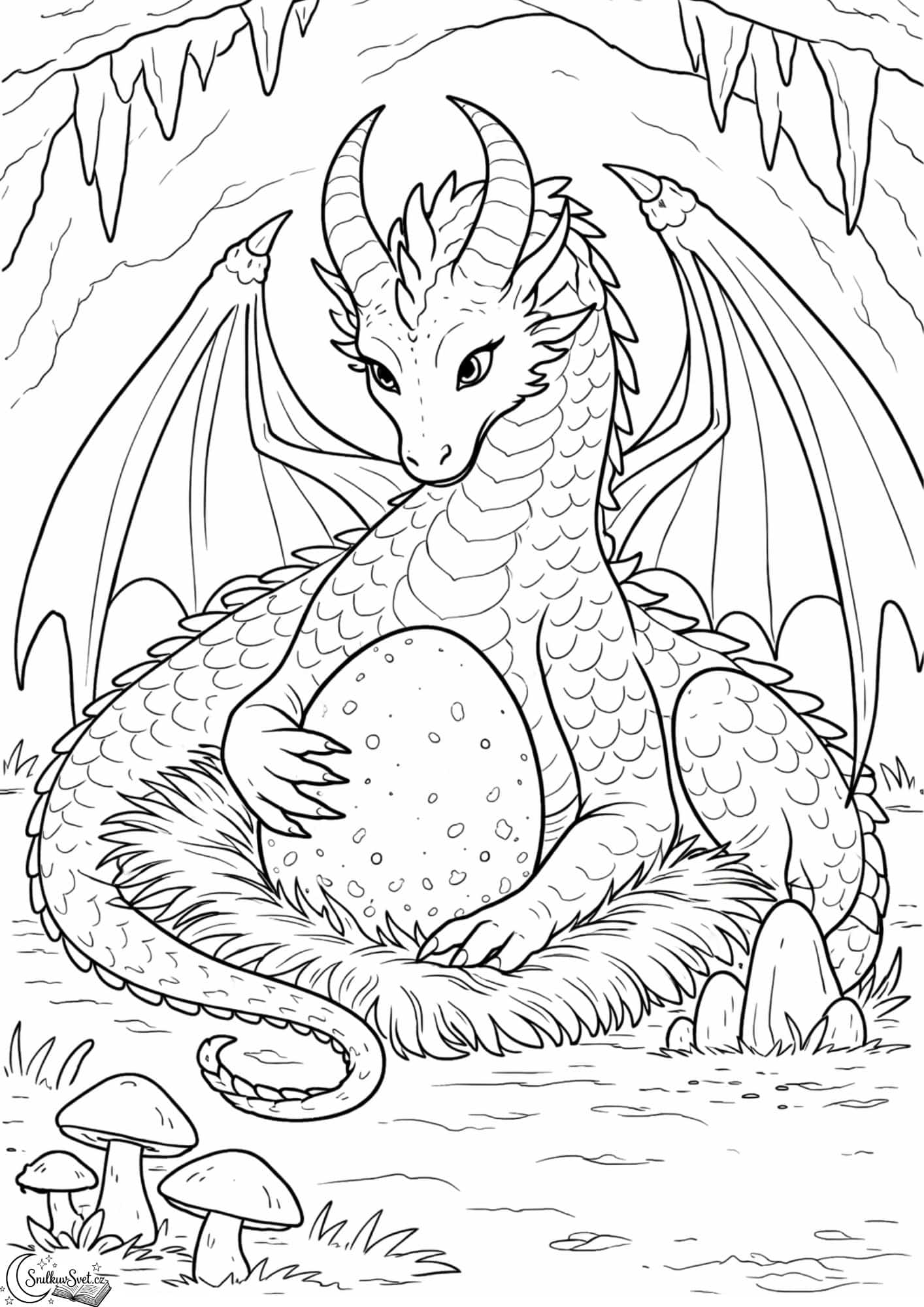 Dračí máma bdí nad svým vajíčkem a nic jí neunikne. Jednoduchá černobílá omalovánka nabízí dostatek prostoru pro fantazii, barvy i vlastní příběh. Vytiskněte si omalovánku pro děti, které mají rády pohádkové bytosti a klidné tvoření.