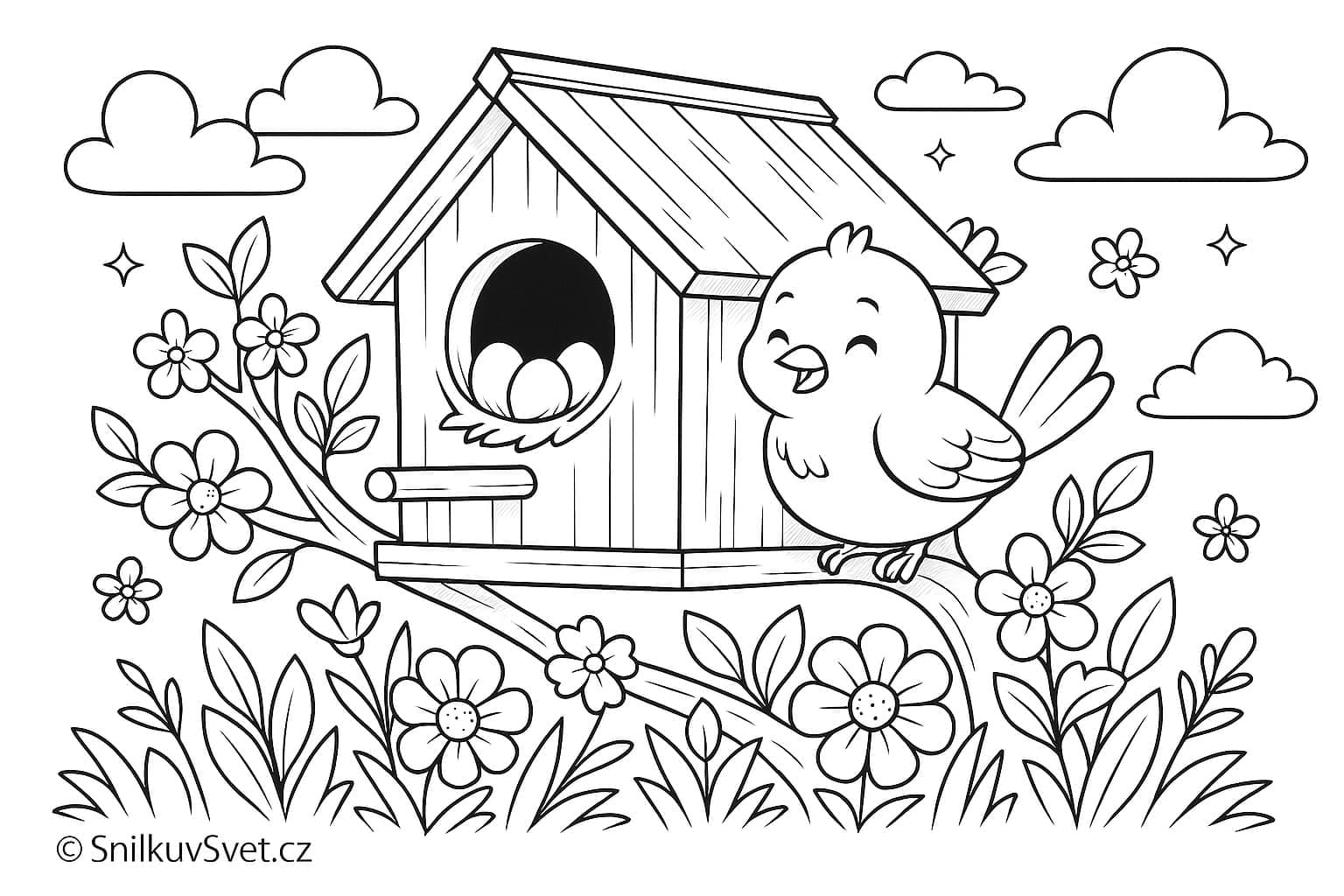 Jarní omalovánka ptáčka na svém krmítku potěší malé i větší tvořivé duše.