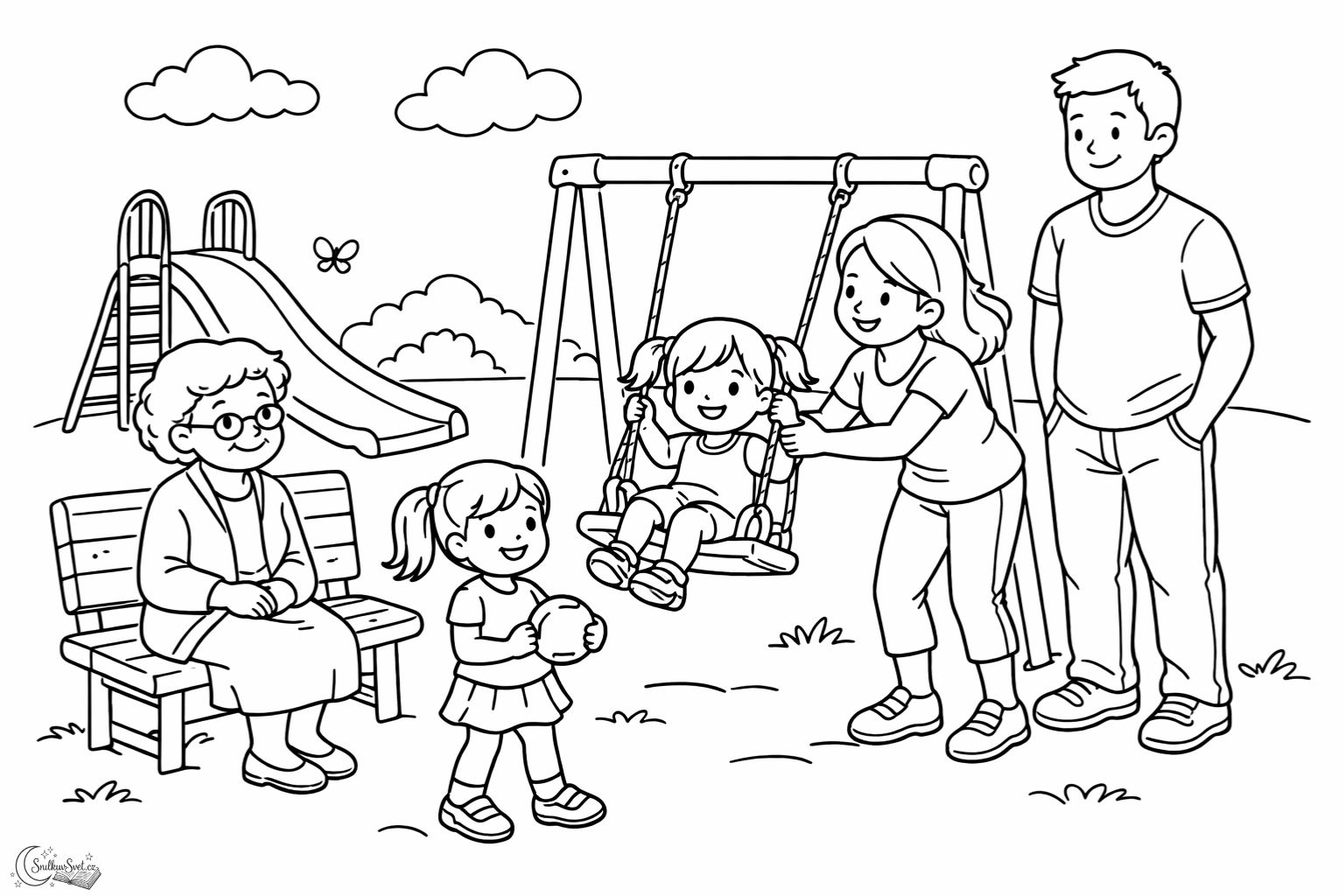 Užijte si vybarvování s touto jednoduchou omalovánkou z dětského hřiště. Obrázek zachycuje rodinu při obyčejném, ale krásném odpoledni na hřišti. Maminku, tatínka, babičku na lavičce a dvě malé holčičky. Díky čistému line-art stylu je omalovánka ideální i pro menší děti a skvěle se hodí pro domácí tvoření i do školky.