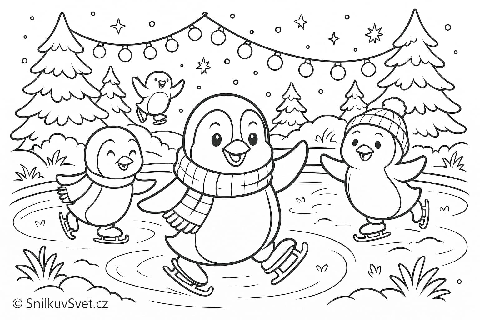 SnilkuvSvet » Omalovánky » Omalovánka tučňáků bruslících na ledě