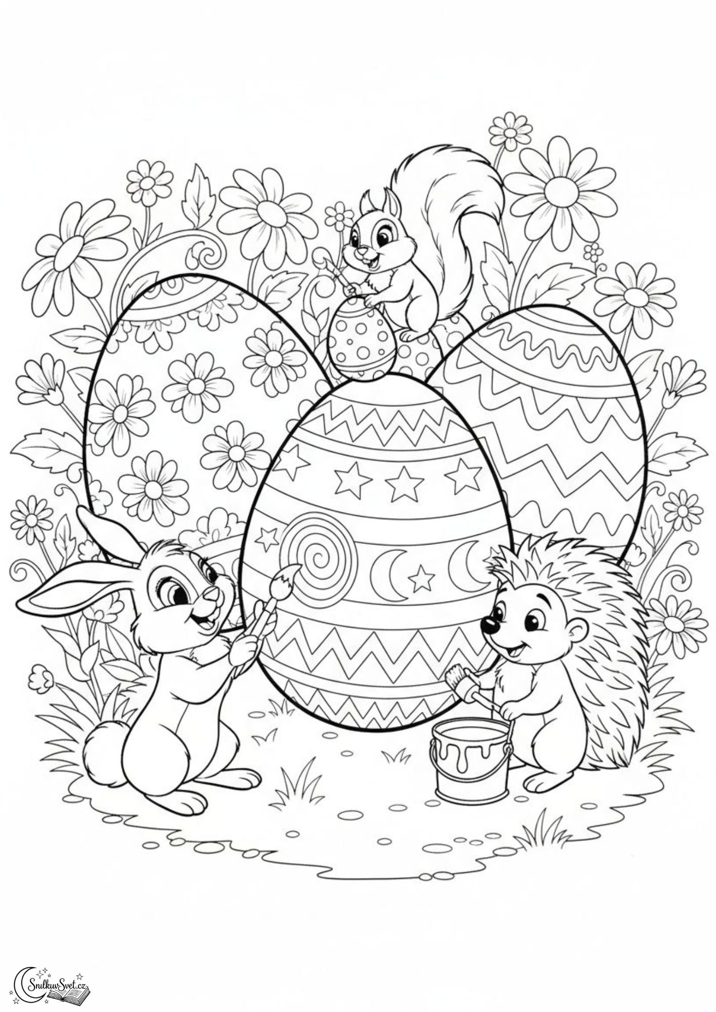 Jaro je ideální čas na tvoření, barvy a společné chvíle s dětmi. Tento roztomilý obrázek zachycuje kouzelnou scénu zvířecích kamarádů, kteří se s nadšením pustili do zdobení velikonočních vajíček. Králíček, ježek i veverka společně malují pestré vzory a užívají si radost z tvoření v tomto jarním období.