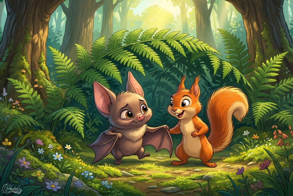 „Netopýr? A co děláš venku v poledne? Netopýři přece spí,“ řekla rezavá šmouha a zkušeně rozlouskla oříšek. Byla to veverka Zrzečka.