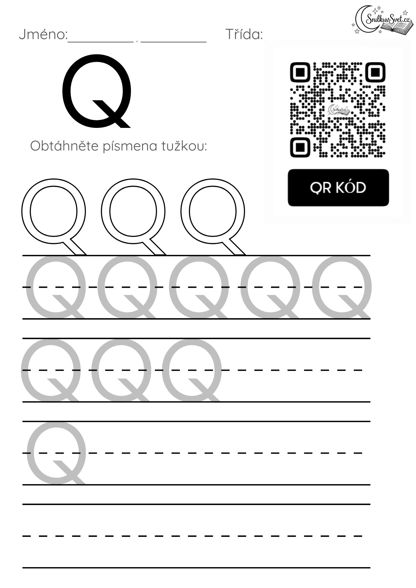 Ačkoliv se písmeno Q v českých slovech vyskytuje zřídka, děti se s ním v digitálním světě setkávají denně. Náš list využívá symbol QR kódu, který je dětem blízký, a učí je tvar písmene O doplněný o charakteristickou nožičku. Je to skvělá příležitost, jak dětem vysvětlit, že i technologie a učení jdou ruku v ruce.