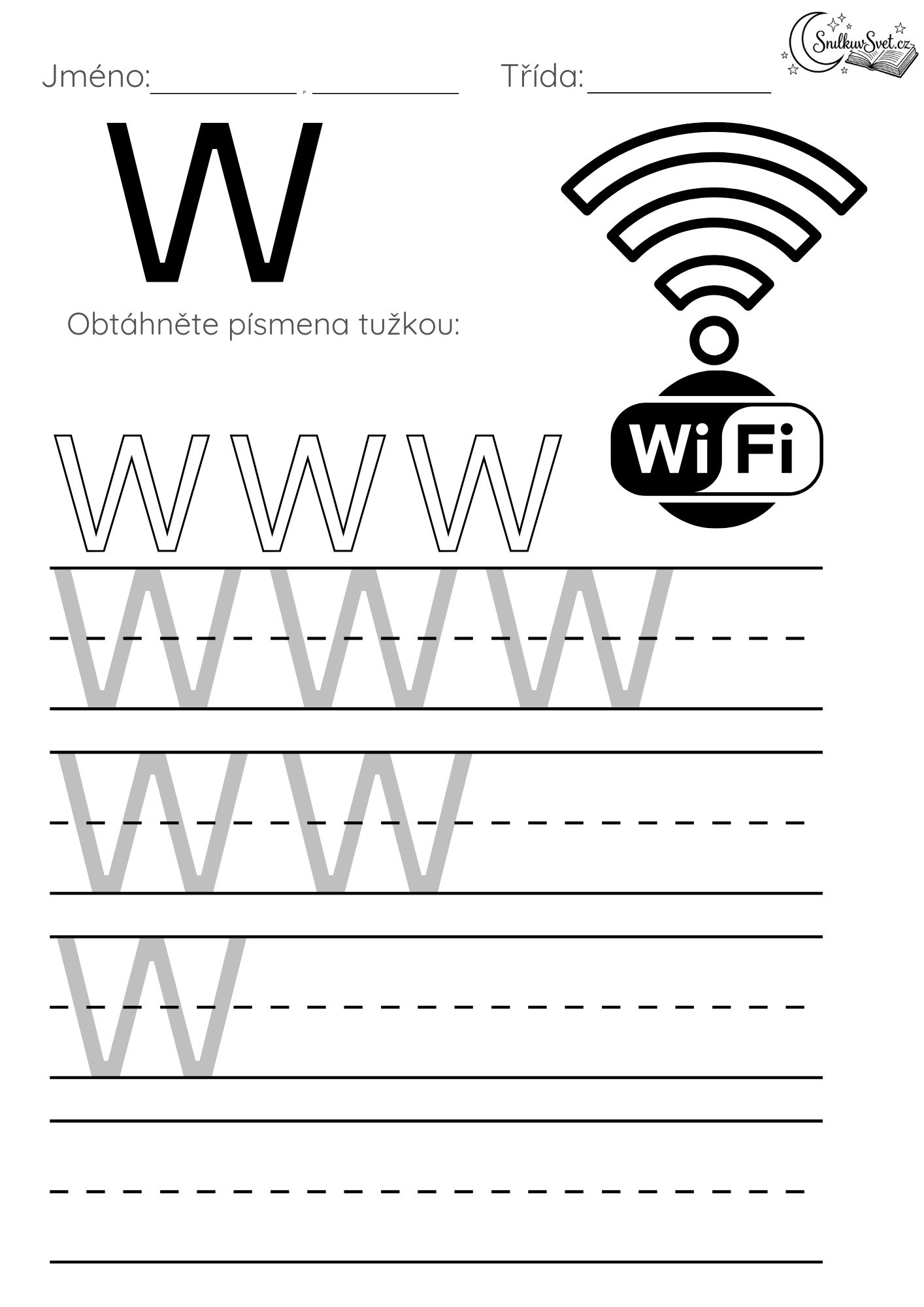 Písmeno W, to jsou vlastně dvě V spojená k sobě. Symbol Wifi signálu je pro děti skvělou mnemotechnickou pomůckou pro zapamatování tvaru. Nácvik vyžaduje pravidelnost. Všechny špičky by měly být ve stejné rovině. Je to výborný trénink rytmu ruky při psaní, který se hodí pro budoucí krasopis.