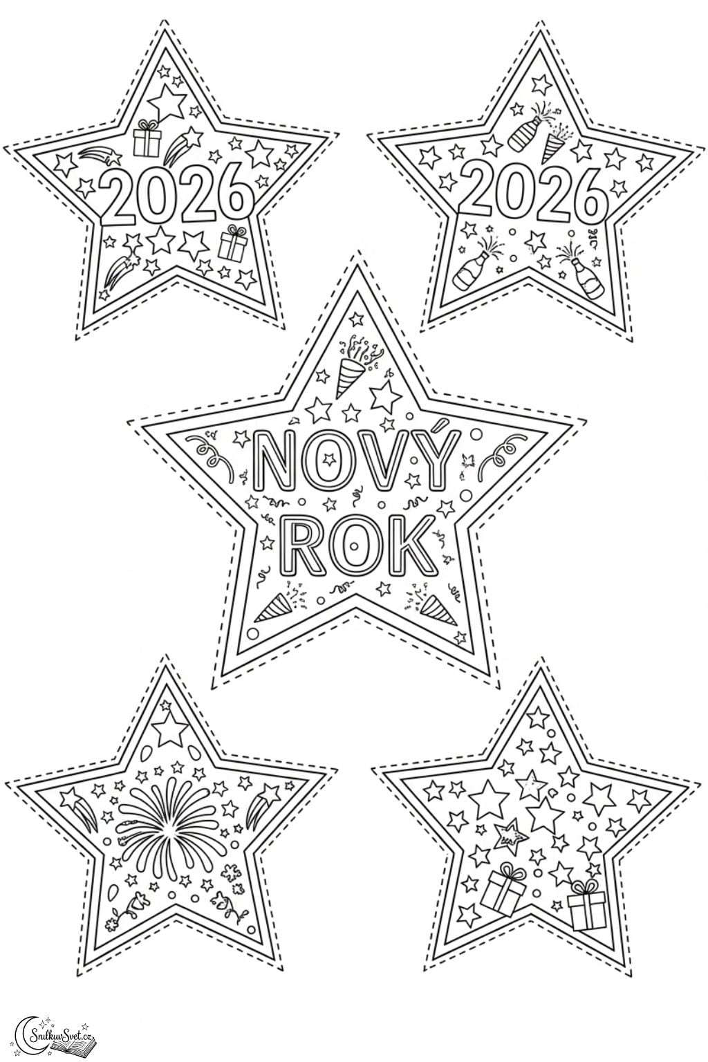 Cesta s naší šablonou: Vytiskněte si šablonu s nápisy „Nový rok“ nebo „2026“. Děti si vybranou hvězdu vybarví pastelkami nebo fixami a následně ji vystřihnou podle přerušované čáry. Takto připravenou hvězdu nalepte na střed vašeho vystřiženého základu z tvrdého papíru.